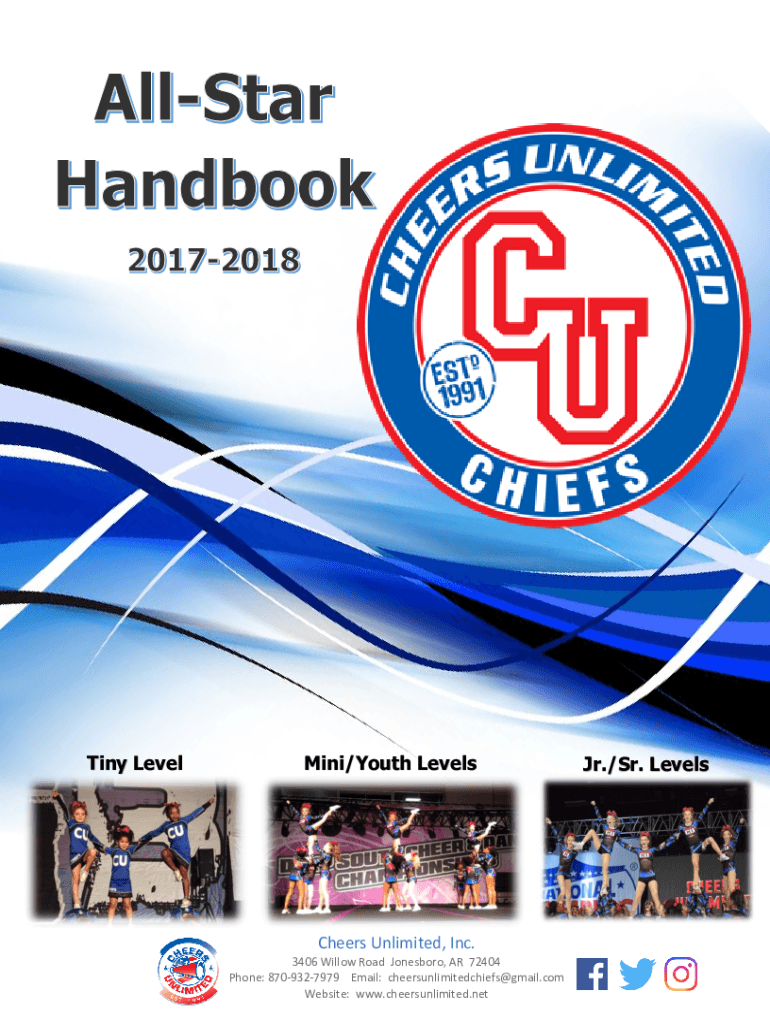 Tiny LevelMini/Youth LevelsCheers Unlimited, Inc. 3406 Willow Road Jonesboro, AR 72404 Phone: 8709327979 Email: cheersunlimitedchiefs@gmail.com Website: www.cheersunlimited.netJr./Sr. Levels20172018