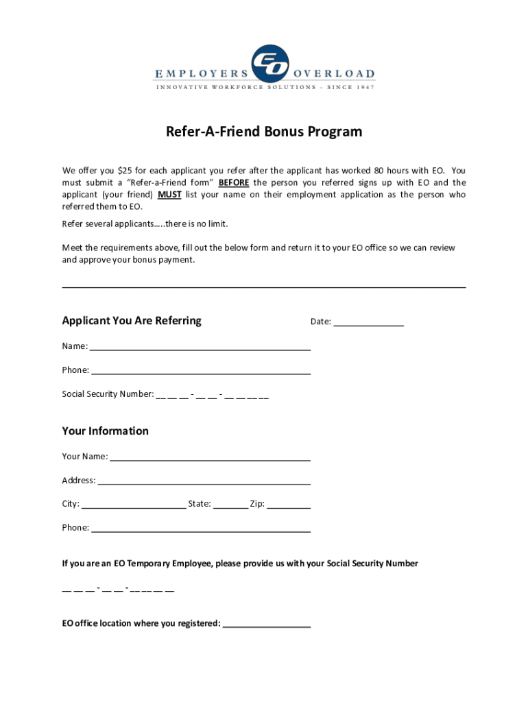 ReferAFriend Bonus Program We offer you $25 for each applicant you refer after the applicant has worked 80 hours with EO. You must submit a ReferaFriend form BEFORE the person you referred signs up