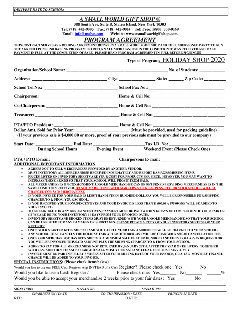 DELIVERY DATE TO SCHOOL: ___A SMALL WORLD GIFT SHOP 388 South Ave. Suite B, Staten Island, New York 10303 Tel: (718) 4429005 Fax: (718) 4429014 Toll Free: 1(800) 5300169 Email: info@molyn.com Website: