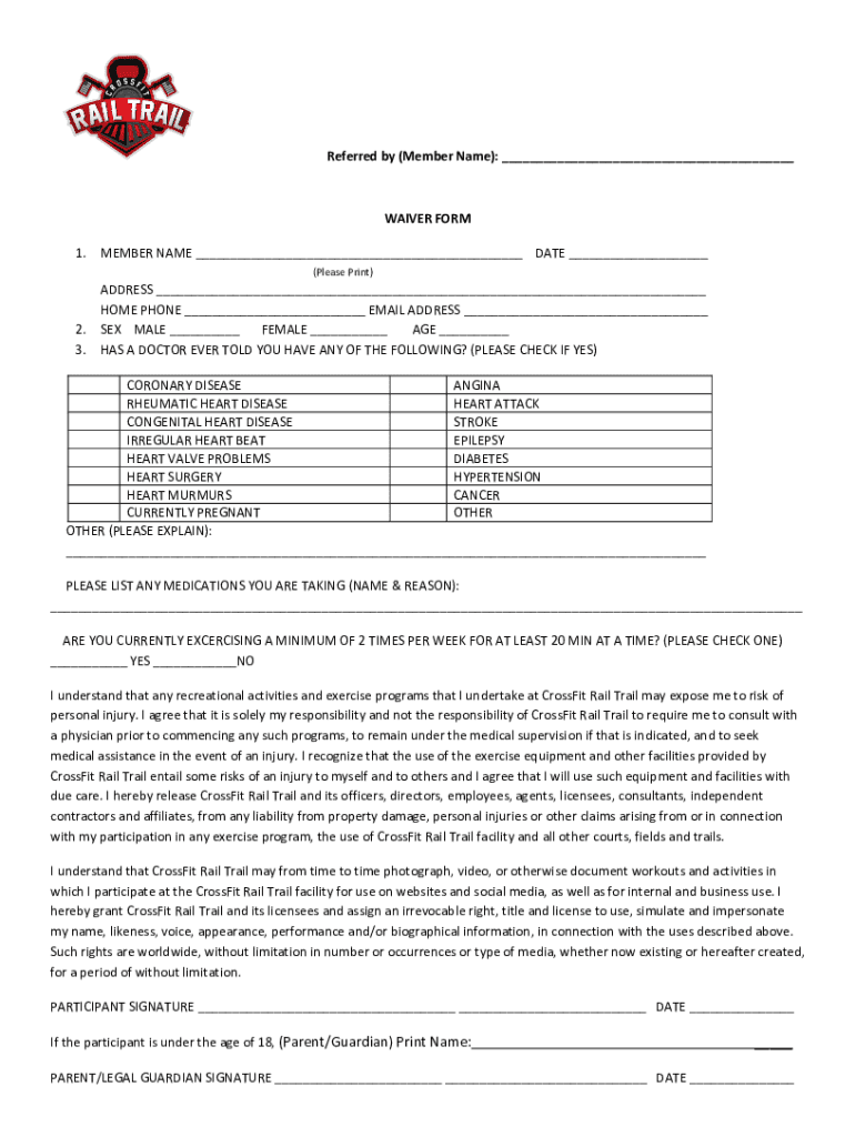 Referred by (Member Name): ___WAIVER FORM 1.MEMBER NAME ___ DATE ___ (Please Print)2. 3.ADDRESS ___ HOME PHONE ___ EMAIL ADDRESS ___ SEX MALE ___ FEMALE ___ AGE ___ HAS A DOCTOR EVER TOLD YOU HAVE