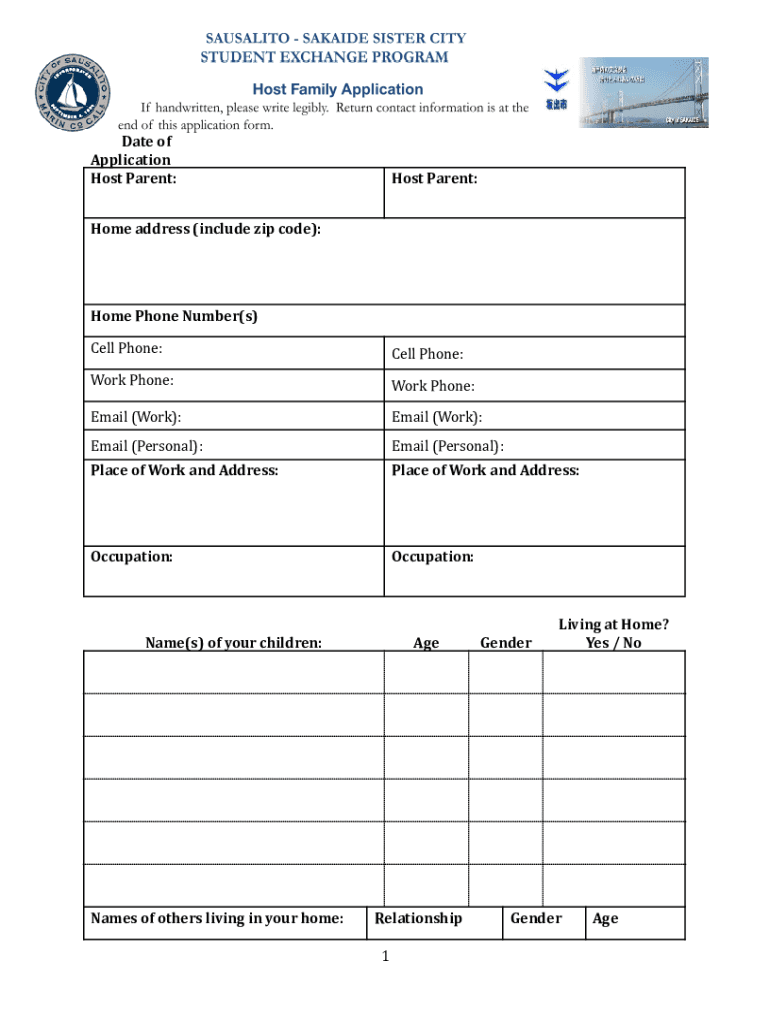 Date of Application Host Parent: Host Parent:Home address (include zip code):Home Phone Number(s)Cell Phone:Cell Phone:Work Phone:Work Phone:Email (Work):Email (Work):Email (Personal):Email (Personal):Place