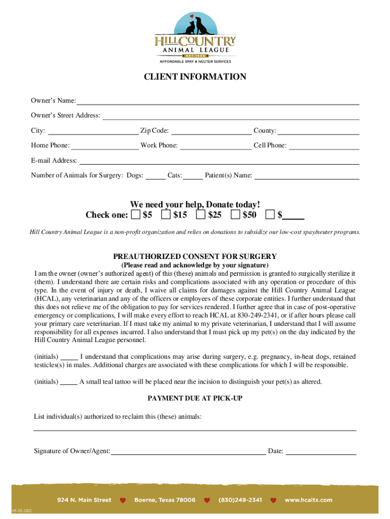 CLIENT INFORMATION Owners Name: Owners Street Address: City:Zip Code:County:Home Phone:Work Phone:Cell Phone:Email Address: Number of Animals for Surgery: Dogs:Cats:Patient(s) Name:We need your help,