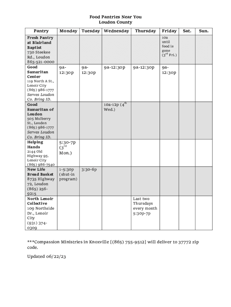 Food Pantries Near You Loudon County Pantry Fresh Pantry at Blairland Baptist 730 Steekee Rd., Loudon 8655210000 Good Samaritan CenterMondayTuesday WednesdayThursdayFridaySat.10a until food is gone
