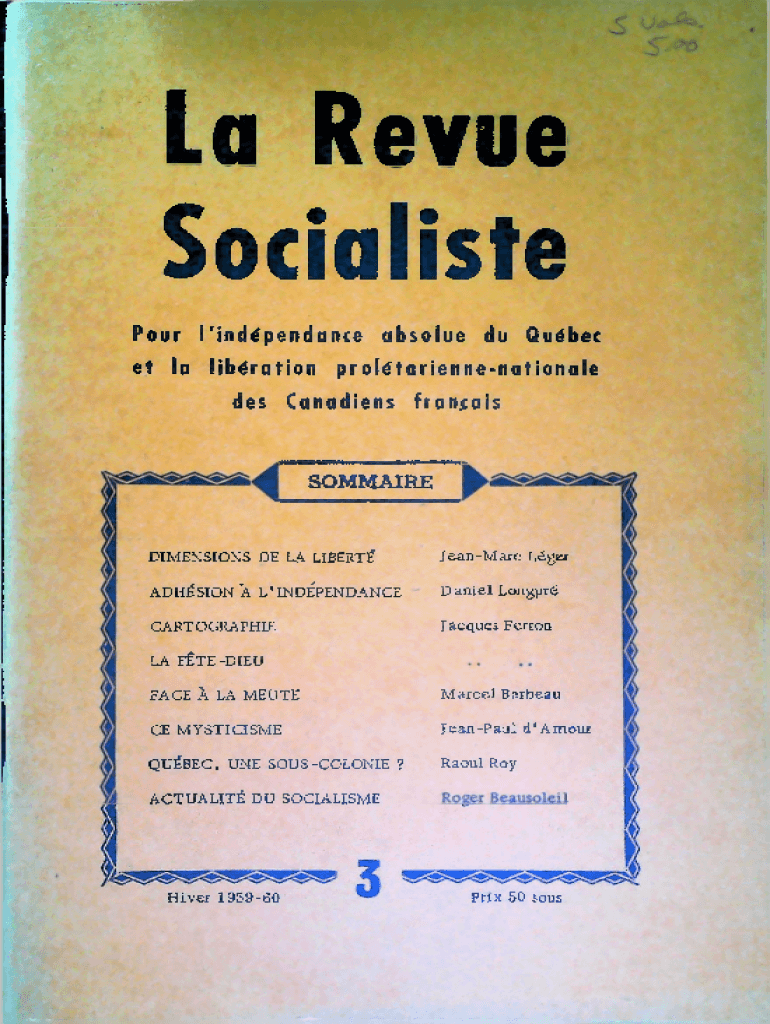 La Revue Socialiste Pour l\'indpendance absolue du Qubecet la libration proltariennenationale des Canadiens franaisSOMMAIREDIMENSIONS DE LA LIBERTJeanMarc LgerADHSION L\'INDPENDANCEDaniel LongprCARTOGRAPHIEJacques