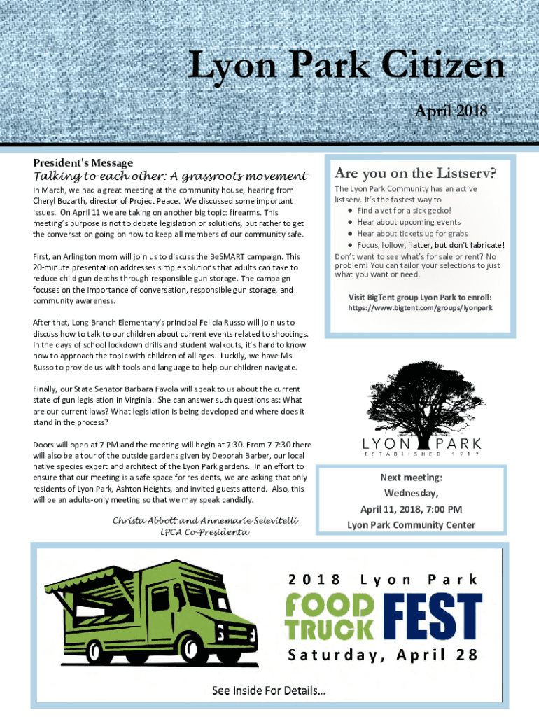 Lyon Park Citizen April 2018 Presidents Message Talking to each other: A grassroots movement In March, we had a great meeting at the community house, hearing from Cheryl Bozarth, director of Project