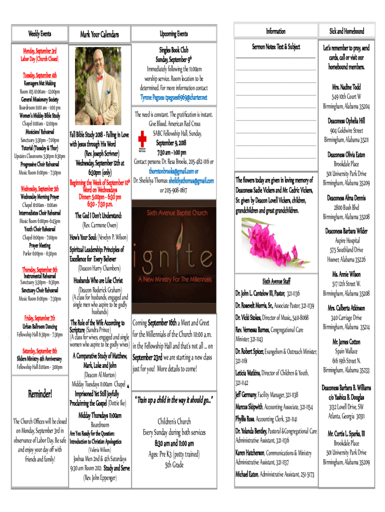 Weekly EventsMark Your CalendarsMonday, September 3rd Labor Day (Church Closed) Tuesday, September 4th Keenagers Mat Making Room 105 10:00am 12:00pm General Missionary Society Boardroom 11:00 am 1:00