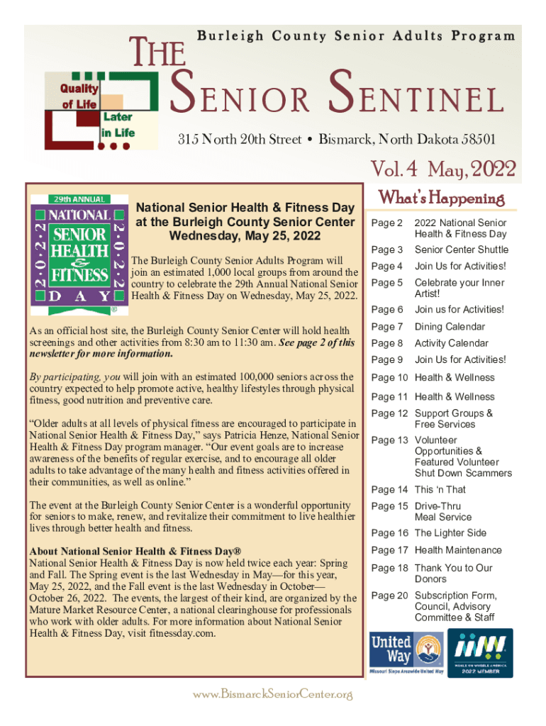 THEBurleigh County Senior Adults ProgramSENIOR SENTINEL 315 North 20th Street Bismarck, North Dakota 58501Vol. 4 May, 2022 National Senior Health & Fitness Day at the Burleigh County Senior Center