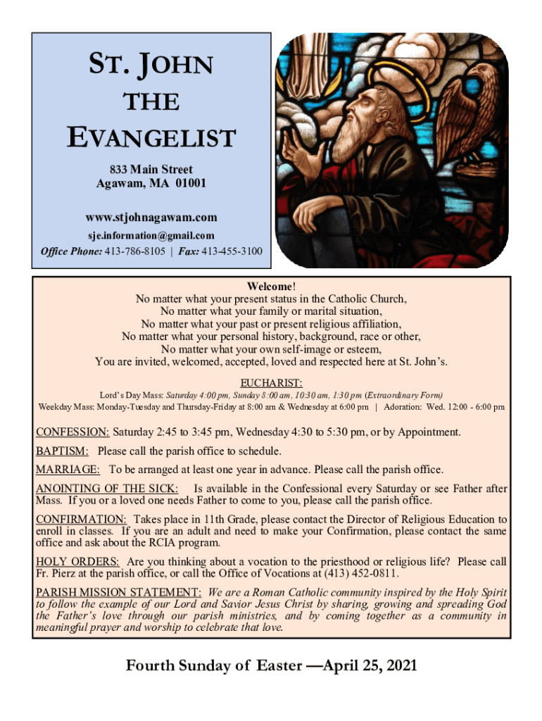 ST. JOHN THE EVANGELIST 833 Main Street Agawam, MA 01001 www.stjohnagawam.com sje.information@gmail.com Office Phone: 4137868105 | Fax: 4134553100Welcome! No matter what your present status in the