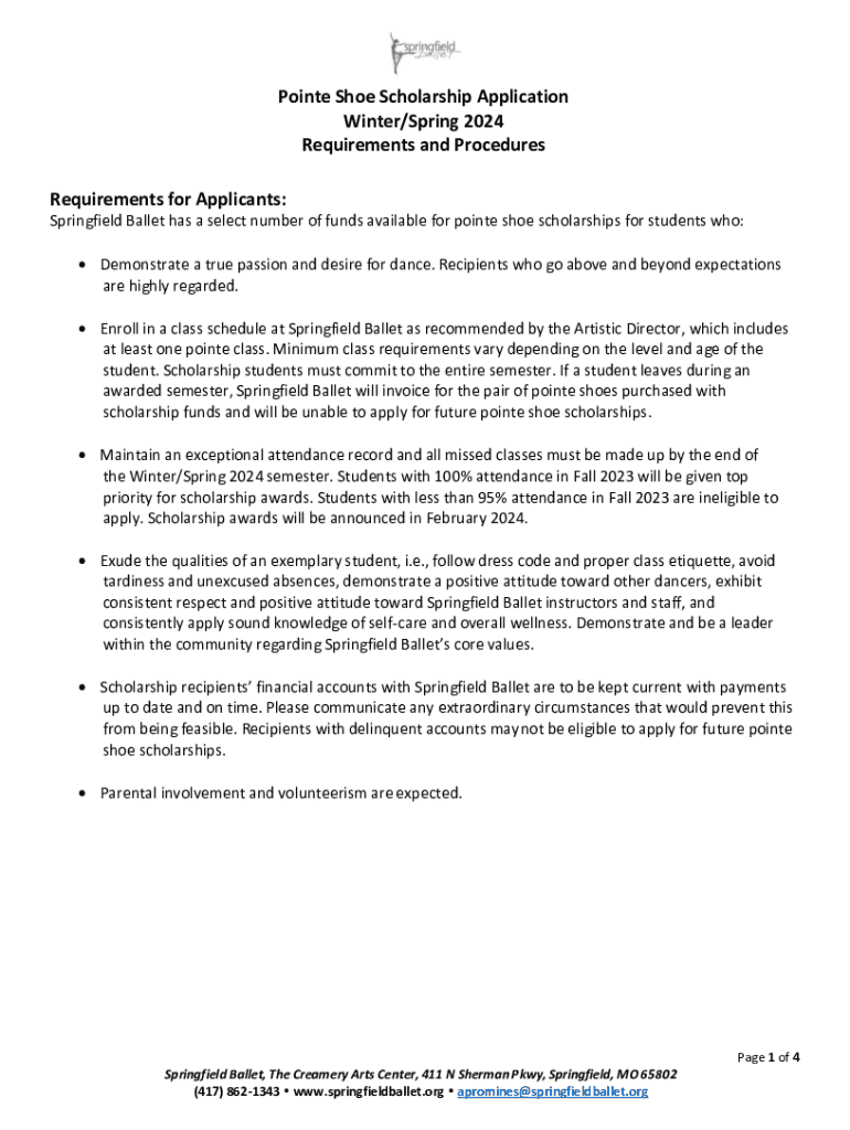 Pointe Shoe Scholarship Application Winter/Spring 2024 Requirements and Procedures Requirements for Applicants: Springfield Ballet has a select number of funds available for pointe shoe scholarships