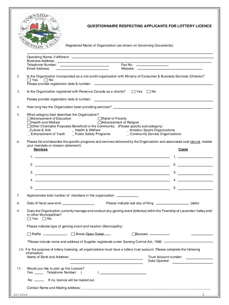 QUESTIONNAIRE RESPECTING APPLICANTS FOR LOTTERY LICENCERegistered Name of Organization (as shown on Governing Documents):1.Operating Name, if different: Business Address: Telephone Number: Email Address:Fax