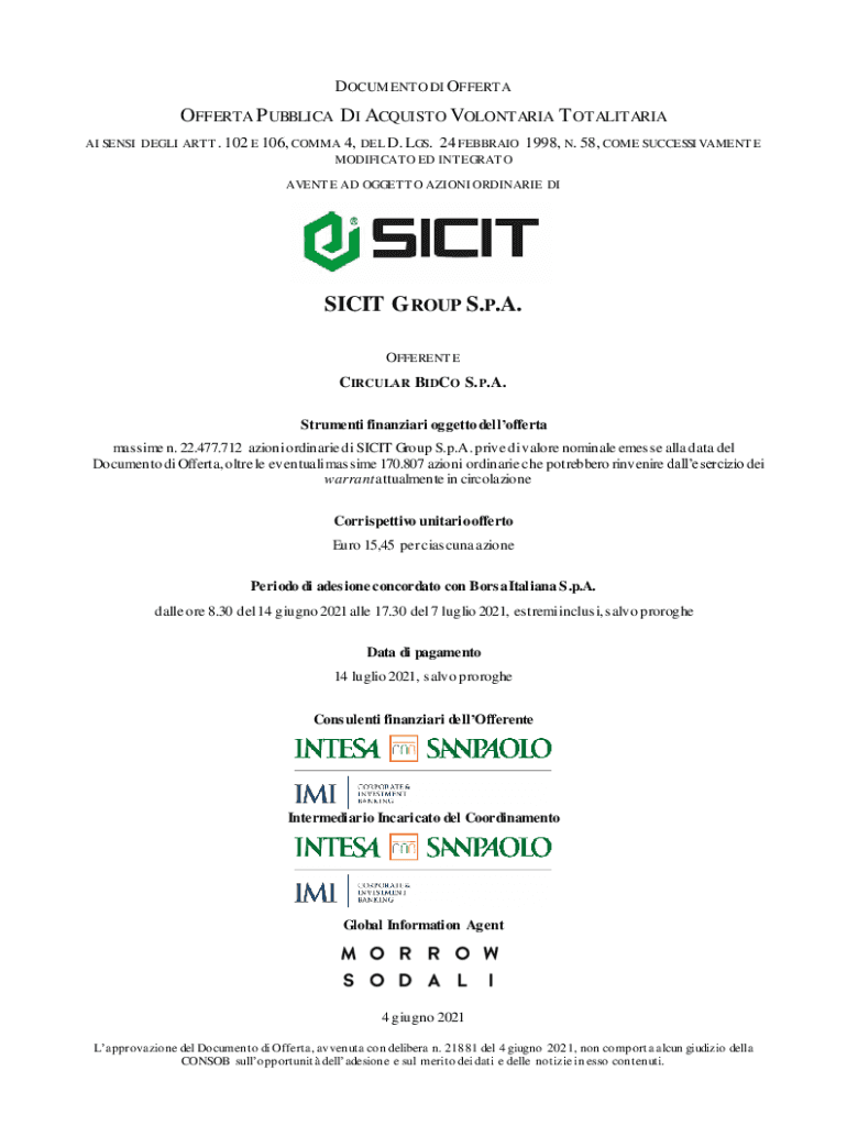 DOCUM ENTO DI OFFERTAOFFERTA P UBBLICA DI ACQUISTO VOLONTARIA T OTALITARIA AI SENSI DEGLI ART T . 102 E 106, COMMA 4, DEL D. LGS. 24 FEBBRAIO MODIFICAT O ED INT EGRAT O1998, N. 58, COME SUCCESSI VAMENT