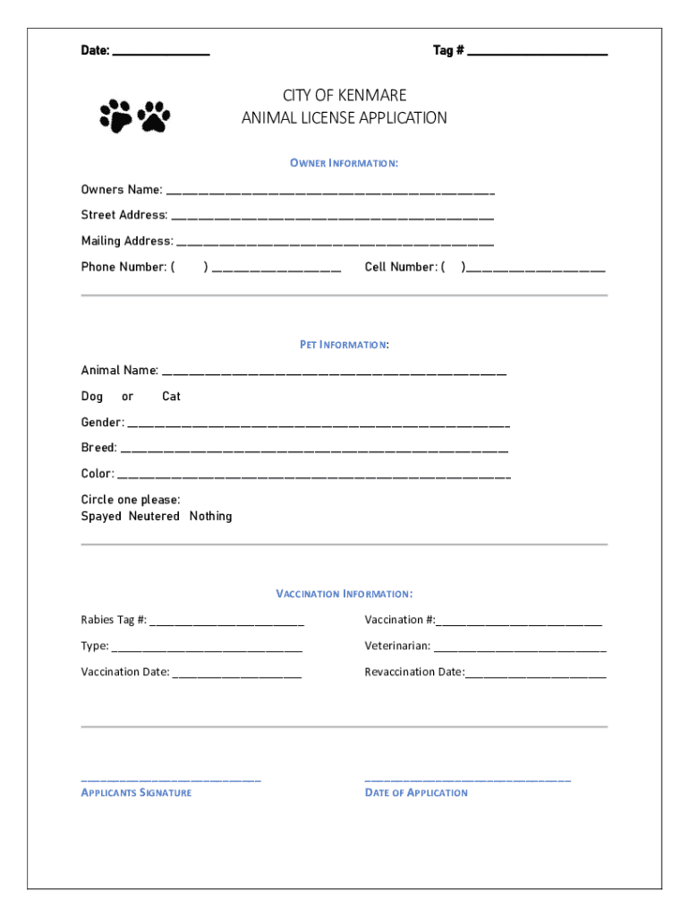 Date: ___Tag # ___CITY OF KENMARE ANIMAL LICENSE APPLICATION OWNER INFORMATION: Owners Name: ___ Street Address: ___ Mailing Address: ___ Phone Number: () ___Cell Number: ()___PET INFORMATION: Animal