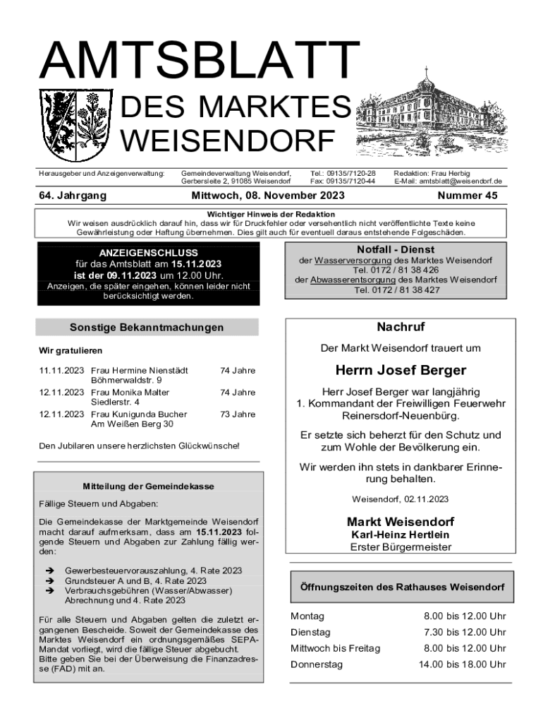 AMTSBLATT DES MARKTES WEISENDORF Herausgeber und Anzeigenverwaltung:Gemeindeverwaltung Weisendorf, Gerbersleite 2, 91085 Weisendorf64. JahrgangTel.: 09135/712028 Fax: 09135/712044Redaktion: Frau Herbig