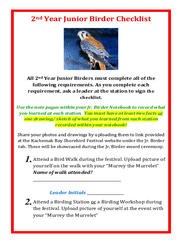 2nd Year Junior Birder ChecklistAll 2nd Year Junior Birders must complete all of the following requirements. As you complete each requirement, ask a leader at the station to sign the checklist. Use