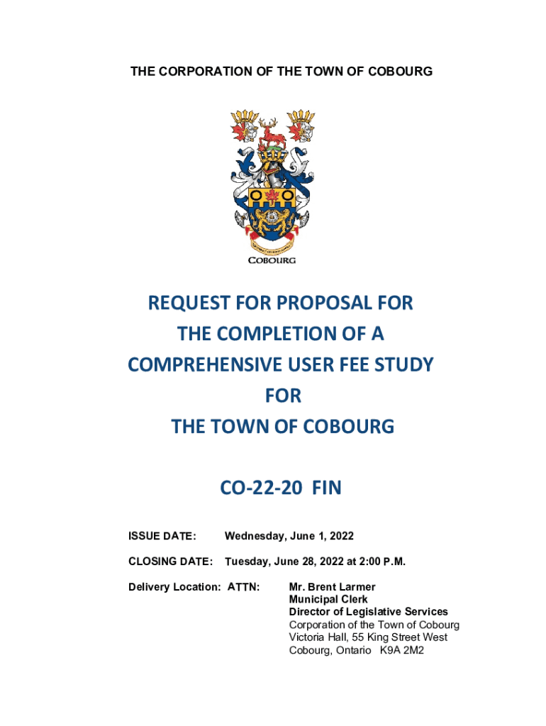 THE CORPORATION OF THE TOWN OF COBOURG REQUESTFORPROPOSALFOR THECOMPLETIONOFA COMPREHENSIVEUSERFEESTUDY FOR THETOWNOFCOBOURG CO2220FIN ISSUE DATE:Wednesday, June 1, 2022CLOSING DATE:Tuesday, June