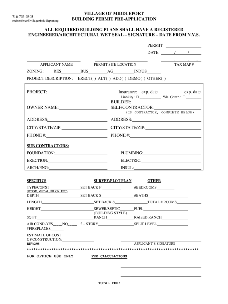 7167353303 code.enforce@villageofmiddleport.orgVILLAGE OF MIDDLEPORT BUILDING PERMIT PREAPPLICATIONALL REQUIRED BUILDING PLANS SHALL HAVE A REGISTERED ENGINEERED/ARCHITECTURAL WET SEAL SIGNATURE DATE