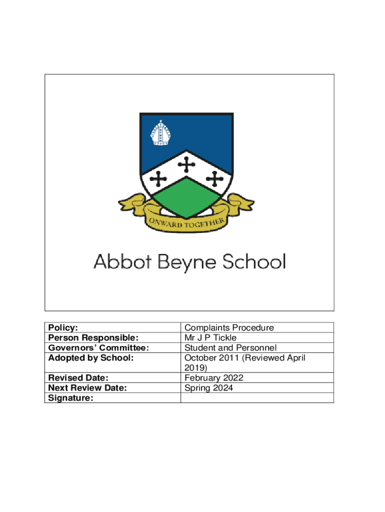 Policy: Person Responsible: Governors Committee: Adopted by School: Revised Date: Next Review Date: Signature:Complaints Procedure Mr J P Tickle Student and Personnel October 2011 (Reviewed April
