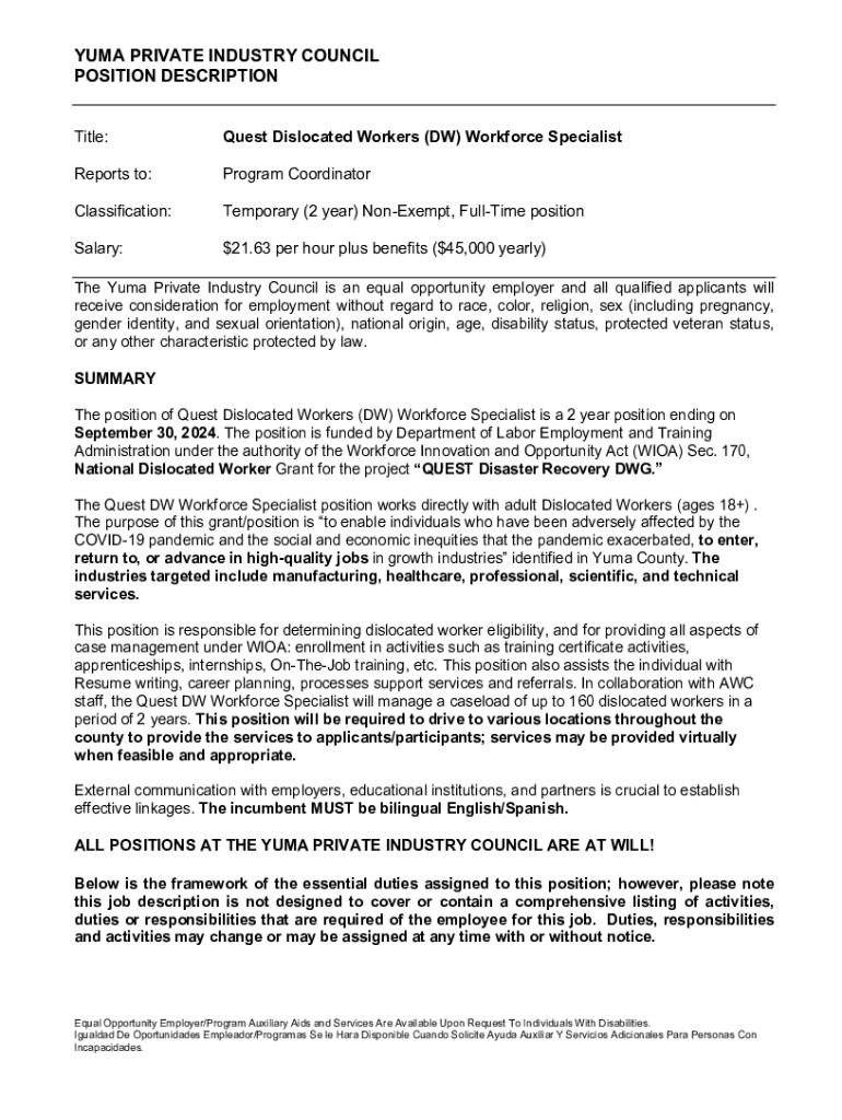 YUMA PRIVATE INDUSTRY COUNCIL POSITION DESCRIPTION Title:Quest Dislocated Workers (DW) Workforce SpecialistReports to:Program CoordinatorClassification:Temporary (2 year) NonExempt, FullTime positionSalary:$21.63