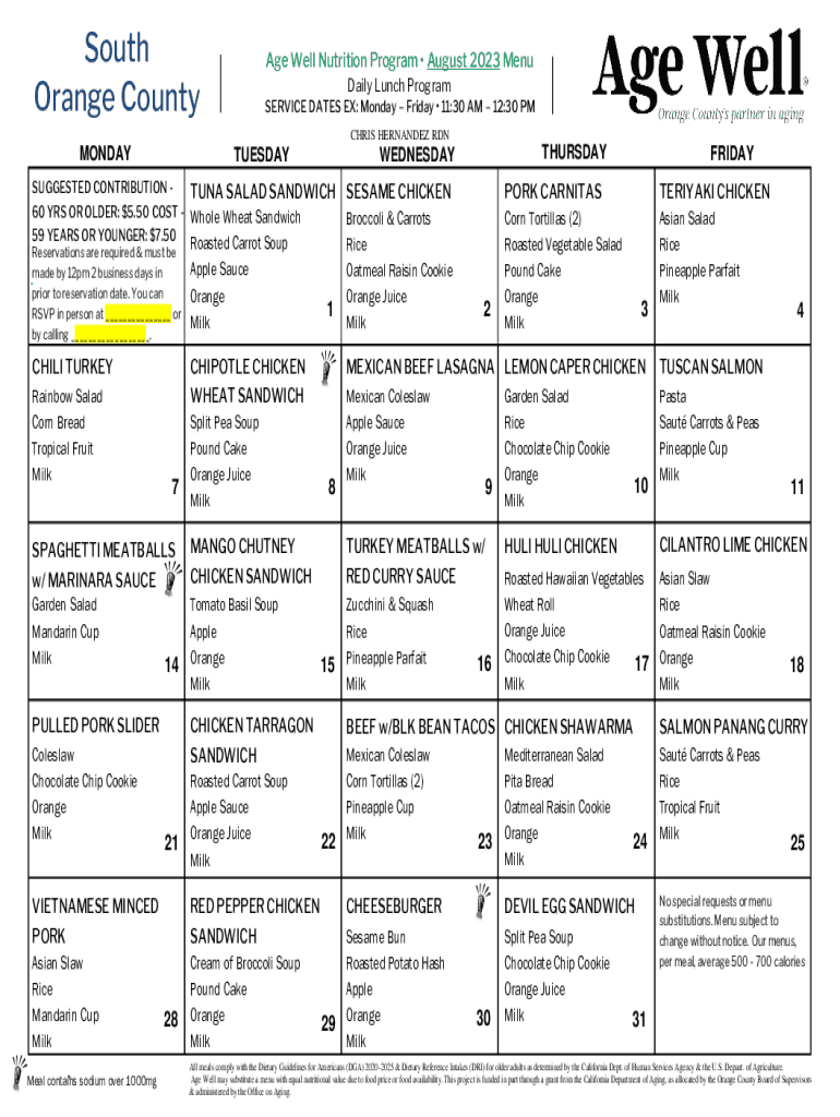 South Orange County MONDAYAge Well Nutrition Program August 2023 Menu Daily Lunch Program SERVICE DATES EX: Monday Friday Monday Friday 11:30 AM 12:30 PM 11:30 AM 12:30 PMt TUESDAYCHRIS HERNANDEZ