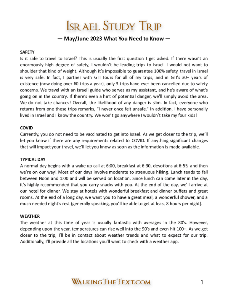IsitsafetotraveltoIsrael?Thisisusuallytherstques onIgetasked.Iftherewasntanenormouslyhighdegreeofsafety,IwouldntbeleadingtripstoIsrael.Iwouldnotwanttoshoulder that kind of weight. Although its impossible to guarantee 100% safety, travel in Israelisverysafe.Infact,IpartnerwithGTIToursforallofmytrips,andinGTIs30+yearsofexistence (now doing over 60 trips a year), only 3