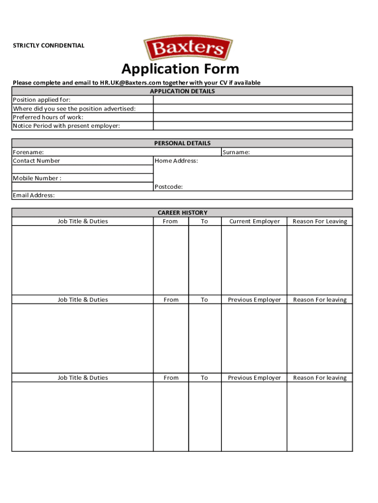 STRICTLY CONFIDENTIALApplication Form Please complete and email to HR.UK@Baxters.com together with your CV if available APPLICATION DETAILS Position applied for: Where did you see the position advertised: