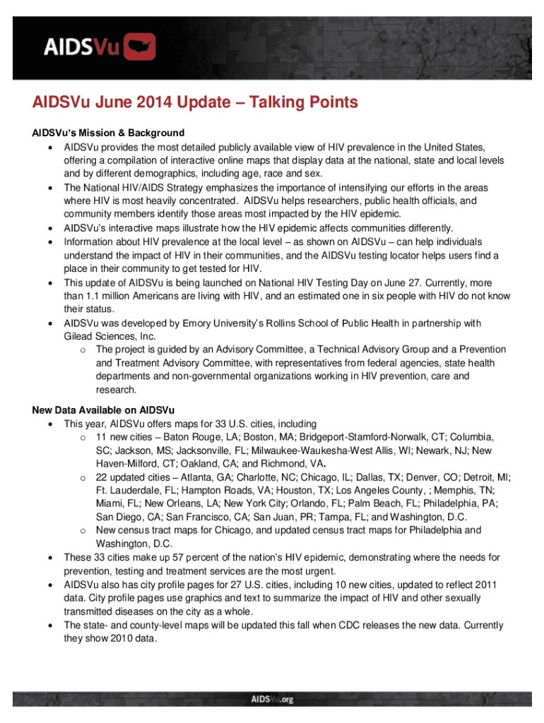 AIDSVu June 2014 Update Talking Points AIDSVus Mission & Background AIDSVu provides the most detailed publicly available view of HIV prevalence in the United States, offering a compilation of interactive