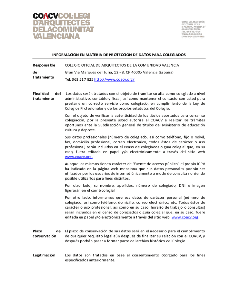 INFORMACIN EN MATERIA DE PROTECCIN DE DATOS PARA COLEGIADOS ResponsableCOLEGIO OFICIAL DE ARQUITECTOS DE LA COMUNIDAD VALENCIAdel tratamientoGran Va Marqus del Turia, 12 8. CP 46005 Valencia (Espaa)