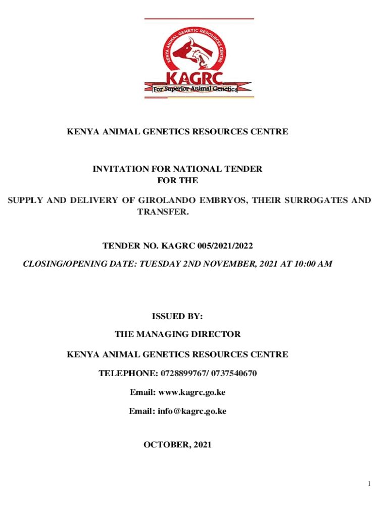 KENYA ANIMAL GENETICS RESOURCES CENTREINVITATION FOR NATIONAL TENDER FOR THE SUPPLY AND DELIVERY OF GIROLANDO EMBRYOS, THEIR SURROGATES AND TRANSFER.TENDER NO. KAGRC 005/2021/2022 CLOSING/OPENING