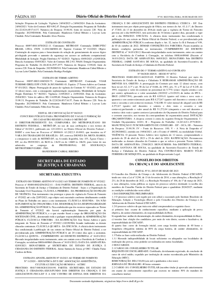 PGINA 103Dirio Oficial do Distrito Federallicitao: Dispensa de Licitao. Vigncia: 24/04/2023 a 24/04/2024. Data da Assinatura: 24/04/2023. Valor do Contrato: R$ 9.092,47. Dotao Oramentria: Programa