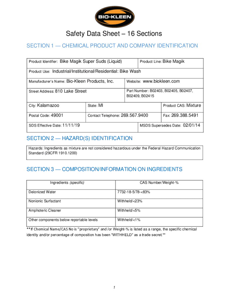 Safety Data Sheet 16 Sections SECTION 1 CHEMICAL PRODUCT AND COMPANY IDENTIFICATION Product Identifier: Product Use:Bike Magik Super Suds (Liquid)Product Line: BikeMagikIndustrial/Institutional/Residential: