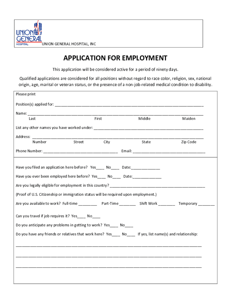 UNION GENERAL HOSPITAL, INCAPPLICATION FOR EMPLOYMENT This application will be considered active for a period of ninety days. Qualified applications are considered for all positions without regard