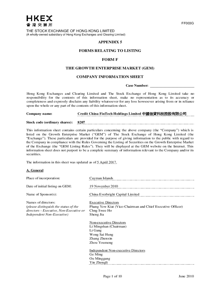 FF003GTHE STOCK EXCHANGE OF HONG KONG LIMITED (A whollyowned subsidiary of Hong Kong Exchanges and Clearing Limited)APPENDIX 5 FORMS RELATING TO LISTING FORM F THE GROWTH ENTERPRISE MARKET (GEM) COMPANY