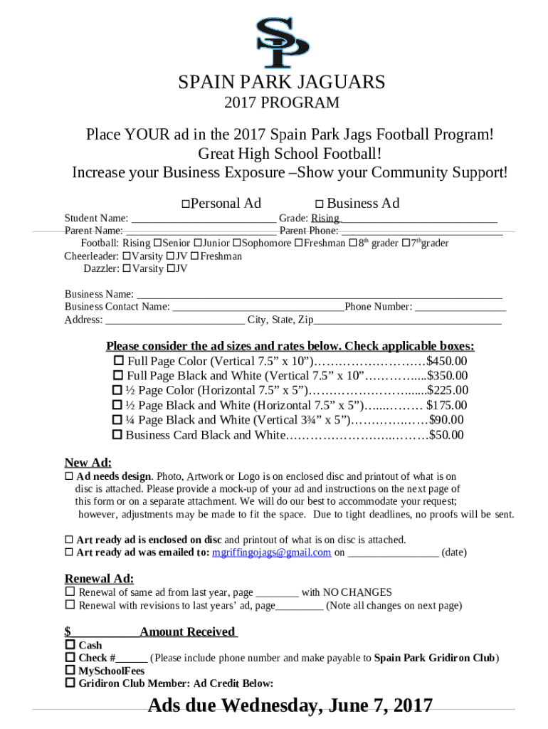 The Spain Park Jaguars - Official Athletic WebsiteBirmingham, AL is a writable document that has to be filled-out and signed for specific purpose. Next, it is furnished to the actual addressee in order to provide some information of any kinds. The completion and signing can be done in hard copy by hand or with an appropriate application like PDFfiller. These tools help to fill out any PDF or Word file without printing them out. While doing that, you can edit it according to your requirements and put an official legal e-signature. Once done, you send the Spain Park Jaguars - Official Athletic WebsiteBirmingham, AL to the recipient or several ones by mail or fax. PDFfiller provides a feature and options that make your blank printable. It offers various settings when printing out. It does no matter how you file a document - in hard copy or by email - it will always look professional and clear. In order not to create a new editable template from scratch over and over, turn the original Word file as a template. After that, you will have a customizable sample.