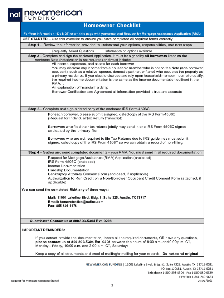 Homeowner Checklist For Your Information Do NOT return this page with your completed Request for Mortgage Assistance Application (RMA)GET STARTED Use this checklist to ensure you have completed all