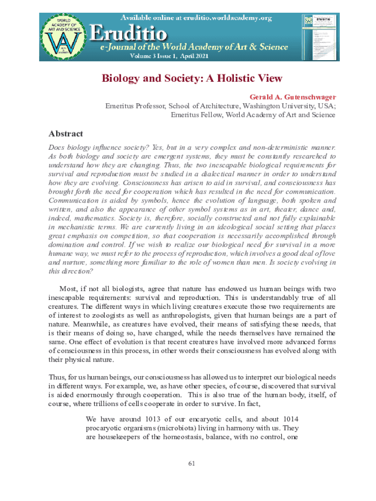 Biology and Society: A Holistic ViewGerald A. Gutenschwager ERUDITIO, Volume 3, Issue 1, April 2021, 6175Biology and Society: A Holistic View Gerald A. Gutenschwager Emeritus Professor, School of