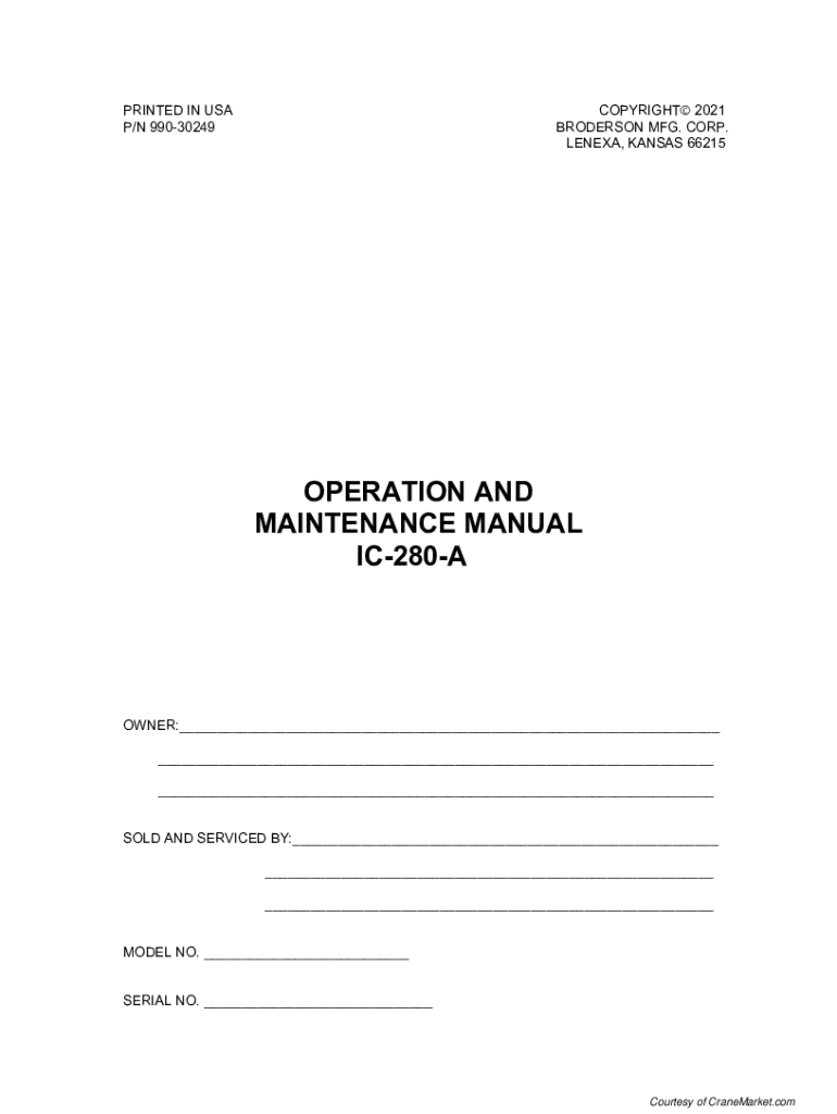 PRINTED IN USA P/N 99030249COPYRIGHT 2021 BRODERSON MFG. CORP. LENEXA, KANSAS 66215OPERATION AND MAINTENANCE MANUAL IC280AOWNER:___ ___ ___ SOLD AND SERVICED BY:___ ___ ___ MODEL NO. ___ SERIAL NO.