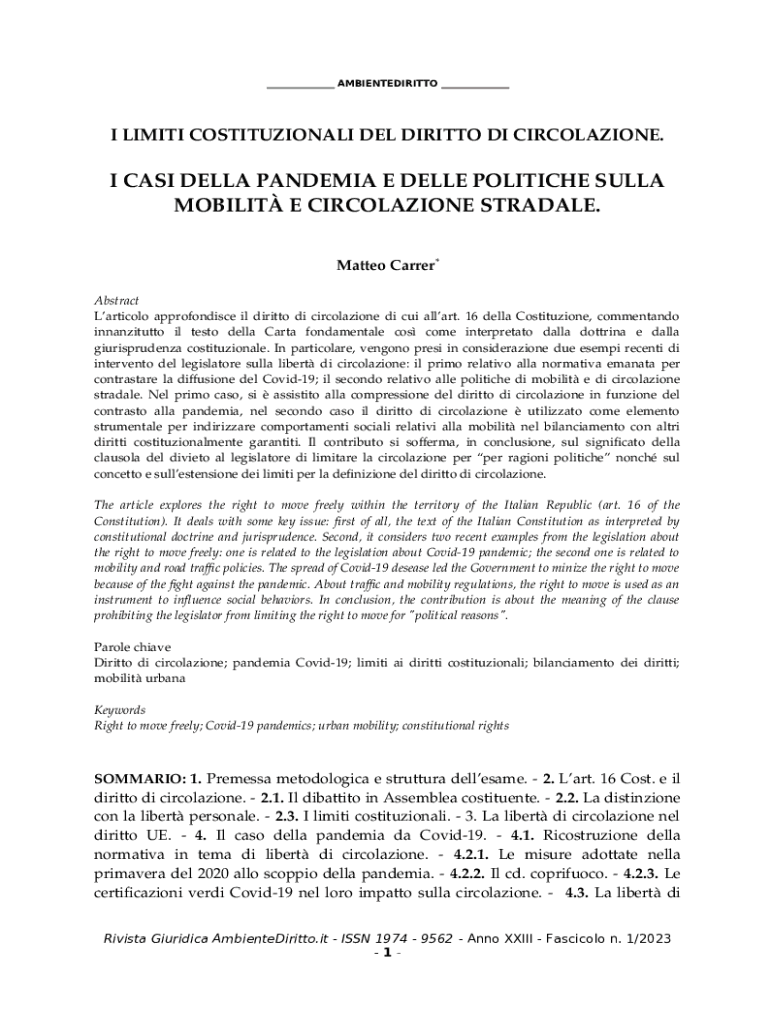 ___ AMBIENTEDIRITTO ___I LIMITI COSTITUZIONALI DEL DIRITTO DI CIRCOLAZIONE.I CASI DELLA PANDEMIA E DELLE POLITICHE SULLA MOBILIT E CIRCOLAZIONE STRADALE. Matteo Carrer* Abstract Larticolo approfondisce
