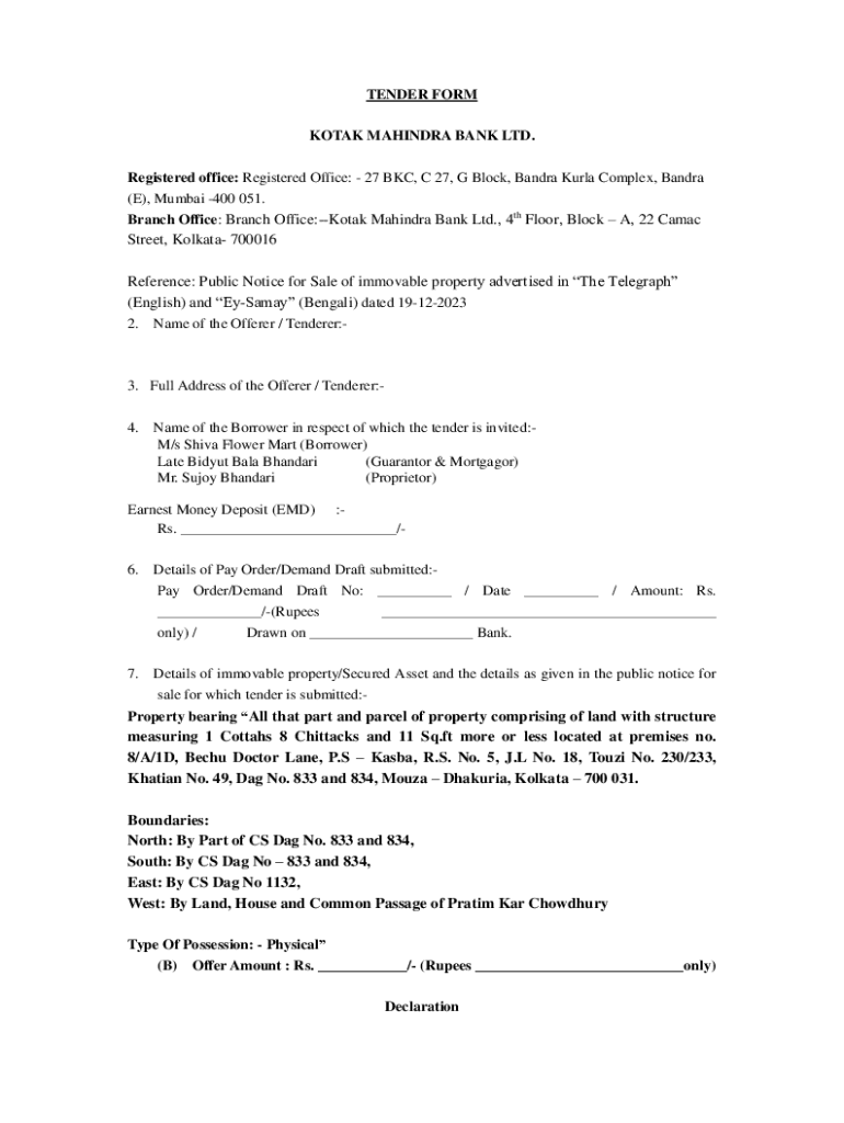 TENDER FORM KOTAK MAHINDRA BANK LTD. Registered office: Registered Office: 27 BKC, C 27, G Block, Bandra Kurla Complex, Bandra (E), Mumbai 400 051. Branch Office: Branch Office:Kotak Mahindra Bank