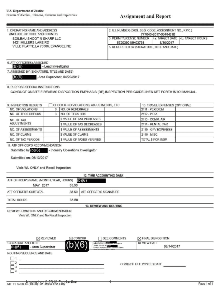 U.S. Department of Justice Bureau of Alcohol, Tobacco. Firearms and ExplosivesAssignment1. OPERATING NAME AND ADDRESS (INCLUDE ZIP CODE AND COUNTY) SOILEAU SHOOT N SHARP LLC 1421 MILLERS LAKE RD VILLE