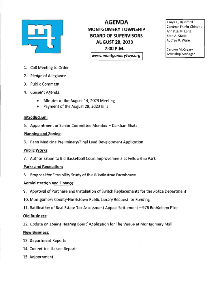 AGENDA MONTGOMERY TOWNSHIP BOARD OF SUPERVISORS AUGUST 28,2023 7:00 P.M. www, m o ntg o me rytw p. o rgTanya C. Bamford Candyce Fluehr ChimeraAnnette M. Long Beth A. StaabAudrey R. Ware Carolyn McCrearyTownship