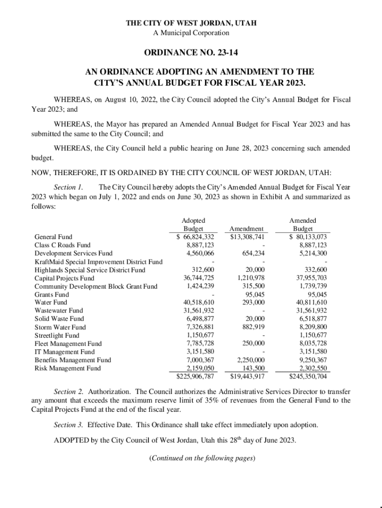 THE CITY OF WEST JORDAN, UTAH A Municipal CorporationORDINANCE NO. 2314 AN ORDINANCE ADOPTING AN AMENDMENT TO THE CITYS ANNUAL BUDGET FOR FISCAL YEAR 2023. WHEREAS, on August 10, 2022, the City Council