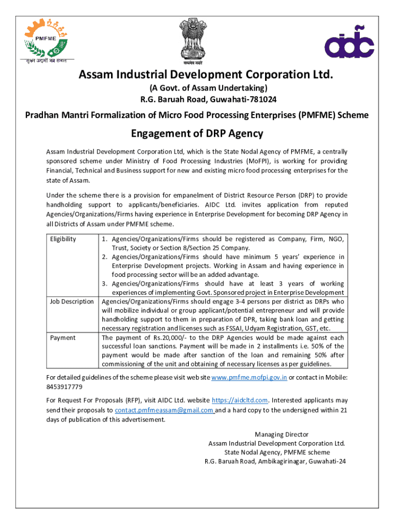 Assam Industrial Development Corporation Ltd. (A Govt. of Assam Undertaking) R.G. Baruah Road, Guwahati781024Pradhan Mantri Formalization of Micro Food Processing Enterprises (PMFME) SchemeEngagement