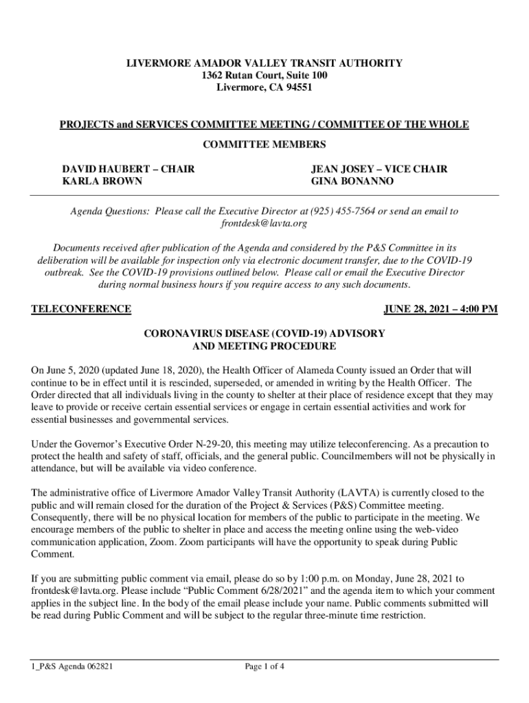 LIVERMORE AMADOR VALLEY TRANSIT AUTHORITY 1362 Rutan Court, Suite 100 Livermore, CA 94551PROJECTS and SERVICES COMMITTEE MEETING / COMMITTEE OF THE WHOLE COMMITTEE MEMBERS DAVID HAUBERT CHAIR KARLA