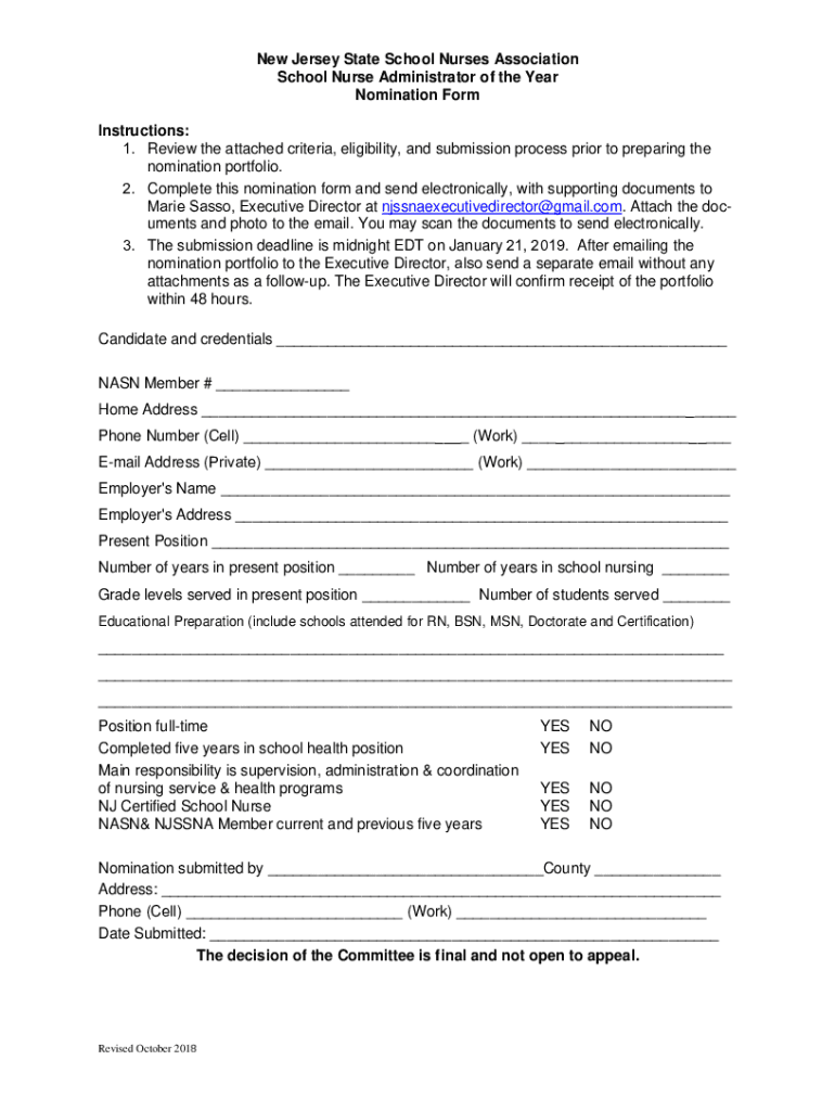 New Jersey State School Nurses Association School Nurse Administrator of the Year Nomination Form Instructions: 1. Review the attached criteria, eligibility, and submission process prior to preparing