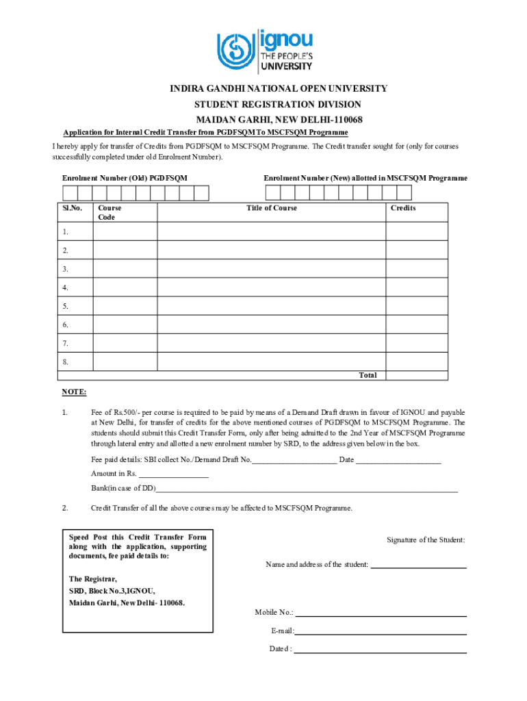 INDIRA GANDHI NATIONAL OPEN UNIVERSITY STUDENT REGISTRATION DIVISION MAIDAN GARHI, NEW DELHI110068 Application for Internal Credit Transfer from PGDFSQM To MSCFSQM Programme I hereby apply for transfer