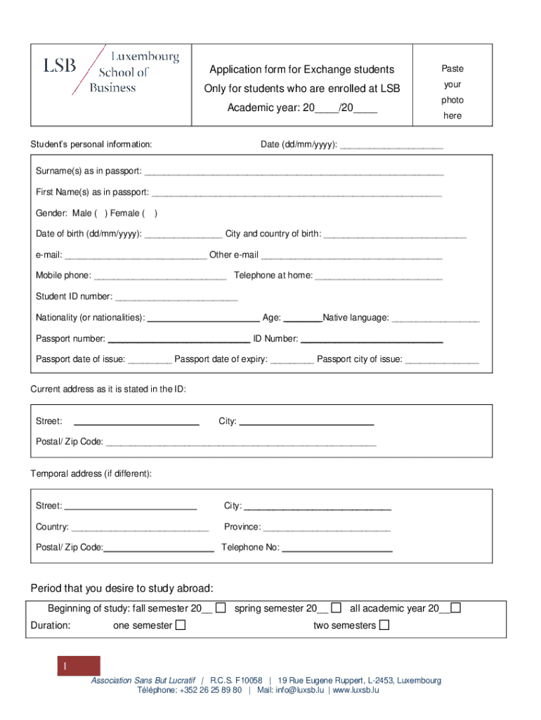 Application form for Exchange studentsPasteOnly for students who are enrolled at LSByour photoAcademic year: 20___/20___ Students personal information:hereDate (dd/mm/yyyy): ___Surname(s) as in passport: