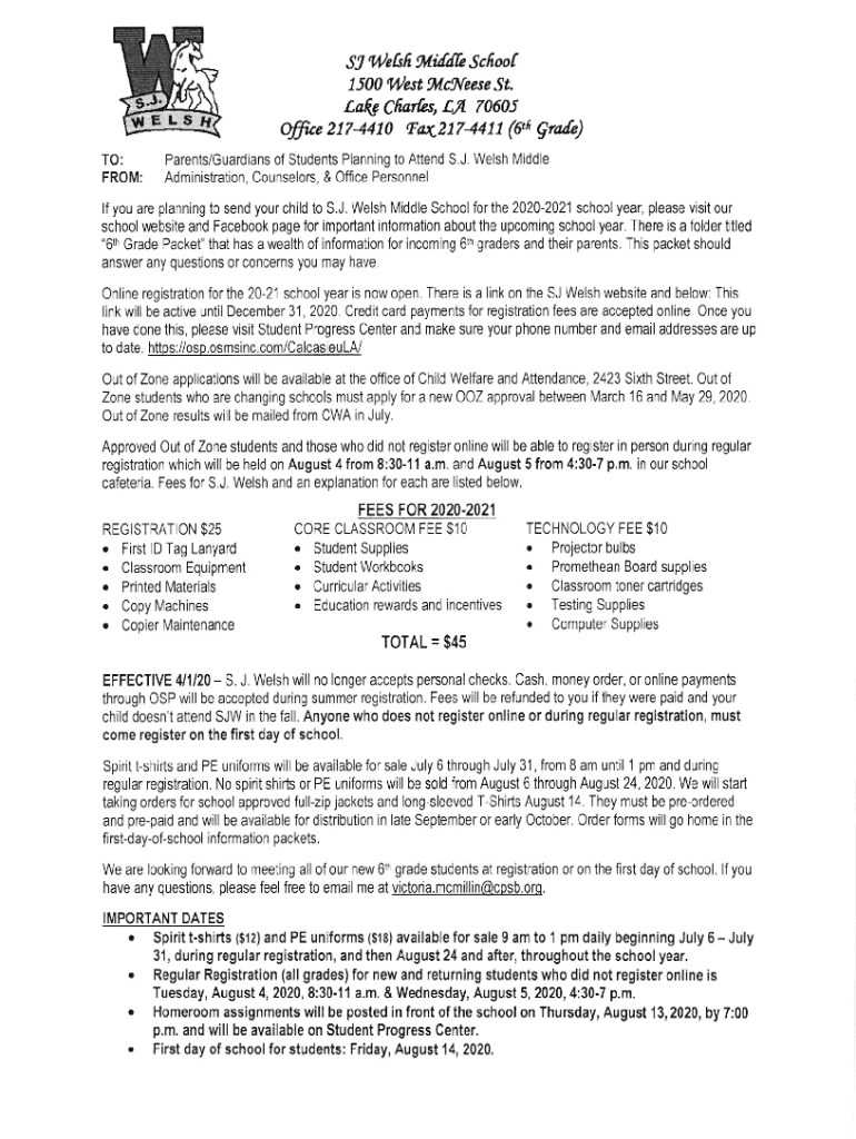 St ilekfi rlifrIe Scfroot fiN l,lest frlcNeese SL LaLtcfrolbs, 70605tALSTO:FROM:OIf.e 2174410 t8a42174411 (en Qrale)Parents/Guardians of Students Planning to Attend S.J. Welsh Middle Administration,