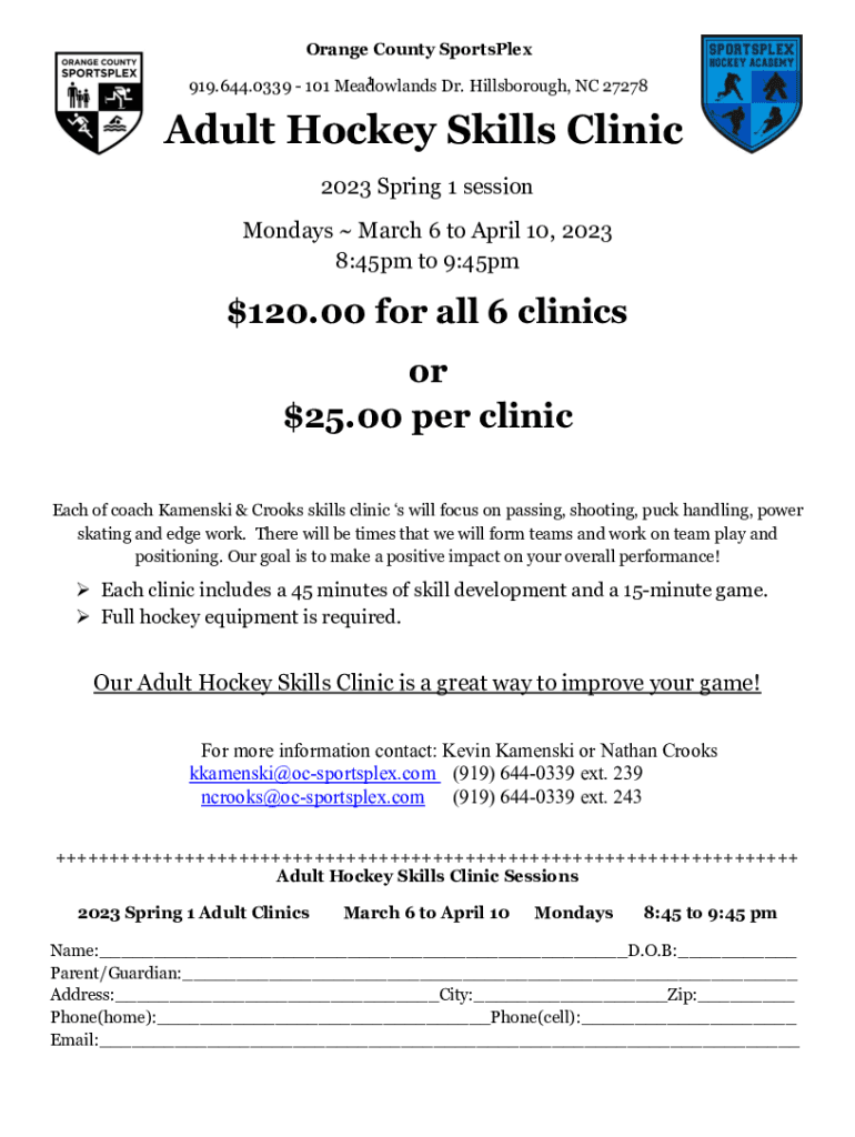 Orange County SportsPlex 1 919.644.0339 101 Meadowlands Dr. Hillsborough, NC 27278Adult Hockey Skills Clinic 2023 Spring 1 session Mondays March 6 to April 10, 2023 8:45pm to 9:45pm$120.00 for all
