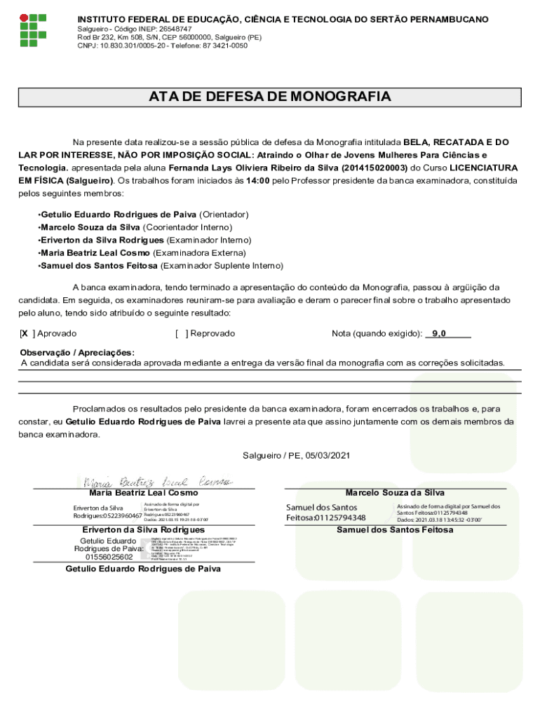 INSTITUTO FEDERAL DE EDUCAO, CIENCIA E TECNOLOGIA DO SERTO PERNAMBUCANO COORDENAO DO CURSO DE LICENCIATURA EM FSICA CURSO DE LICENCIATURA EM FSICAFERNANDA LAYS OLIVEIRA RIBEIRO DA SILVABELA, RECATADA