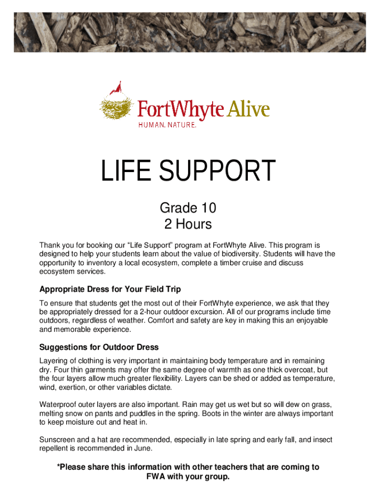 LIFE SUPPORT Grade 10 2 Hours Thank you for booking our Life Support program at FortWhyte Alive. This program is designed to help your students learn about the value of biodiversity. Students will
